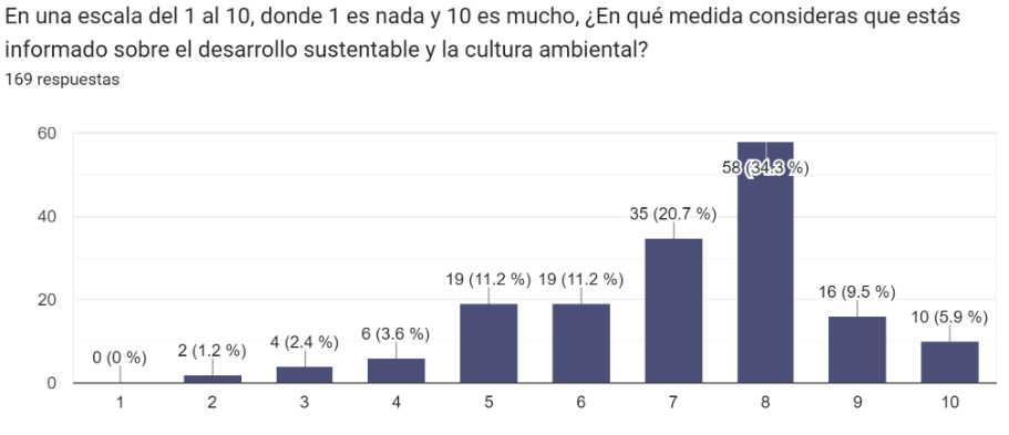 Es por eso que en una encuesta aplicada a una muestra de 167 personas pertenecientes al CECyT 2, se les pidió que marcaran del 1-10 su nivel de conocimiento sobre cultura ambiental, obteniendo que gran parte de la muestra, se considera entre el 7 y el 8, comprobando la falta de información sobre cultura ambiental que hay en nuestra sociedad